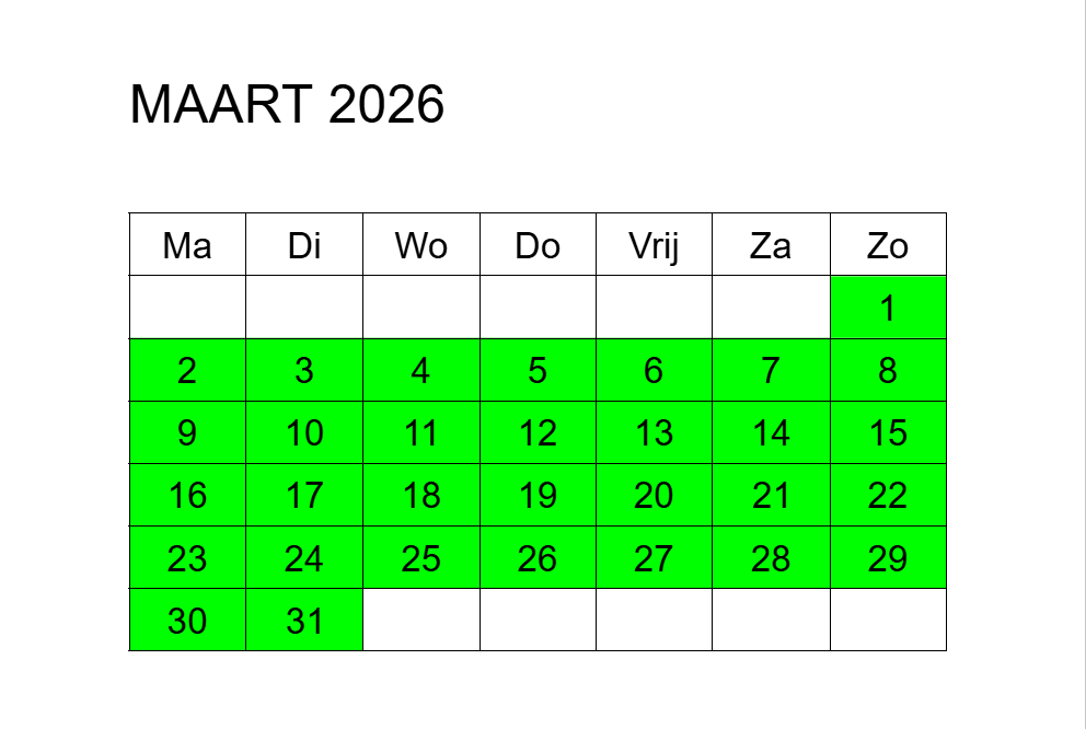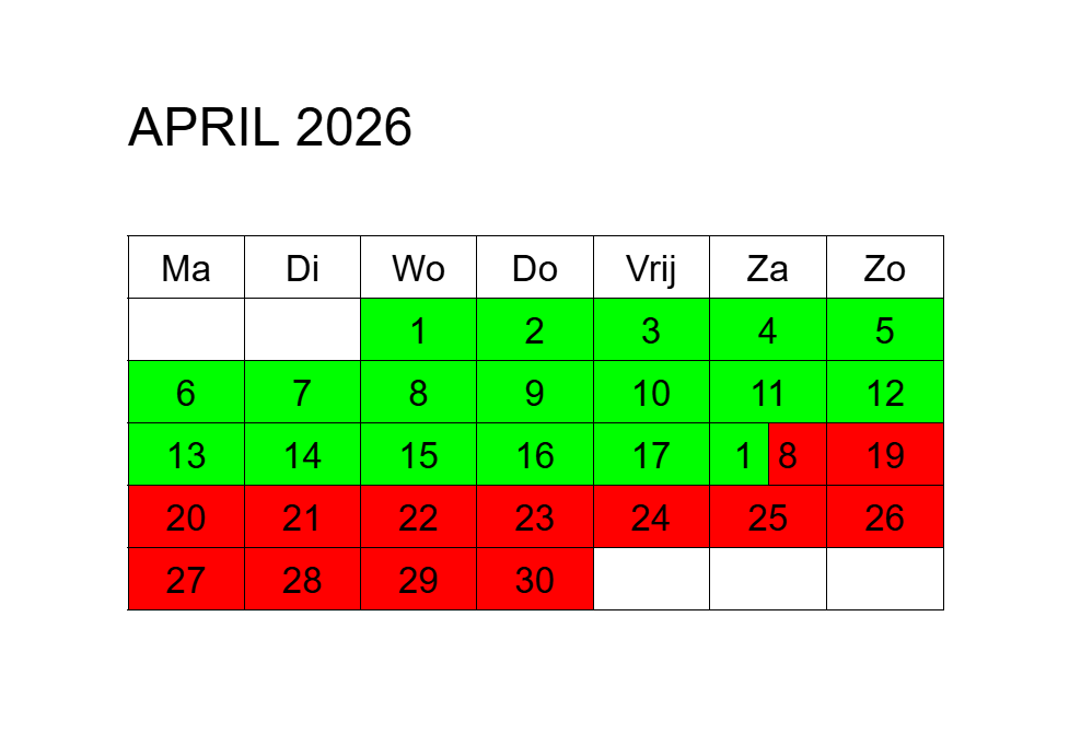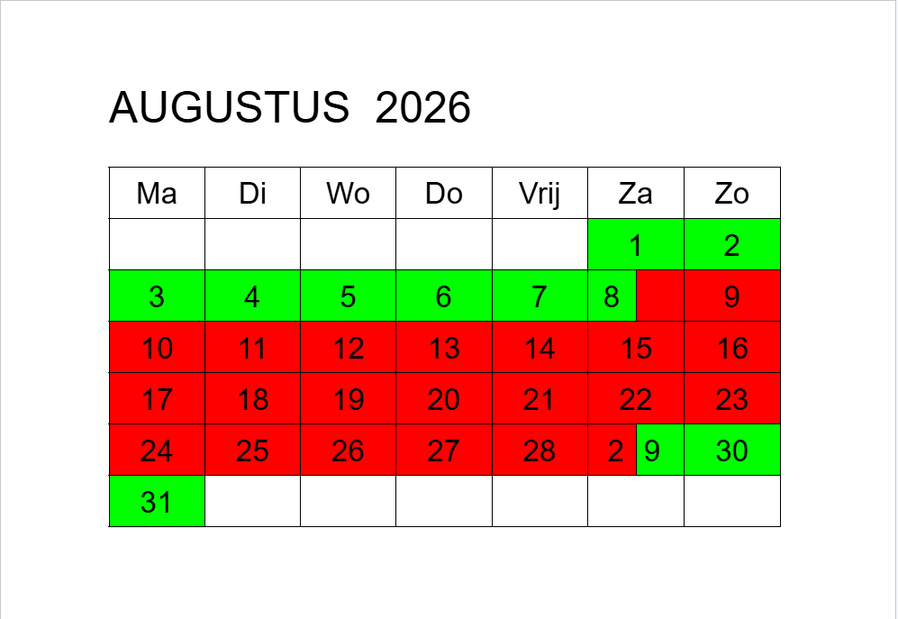 De rode periode is bezet, groen is beschikbaar en oranje is in optie.